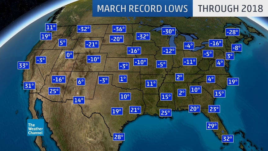 Subzero cold isn't just a feature in winter's peak months of December, January or February. All-time March record lows have been below zero as far south as the Texas Panhandle.