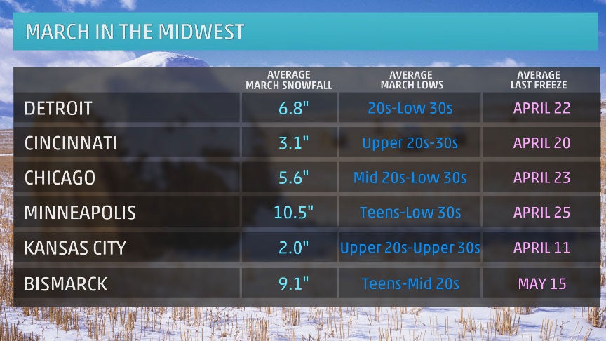 There are no real surprises here: March snow is the norm in the Midwest, with freezes over the entire month.