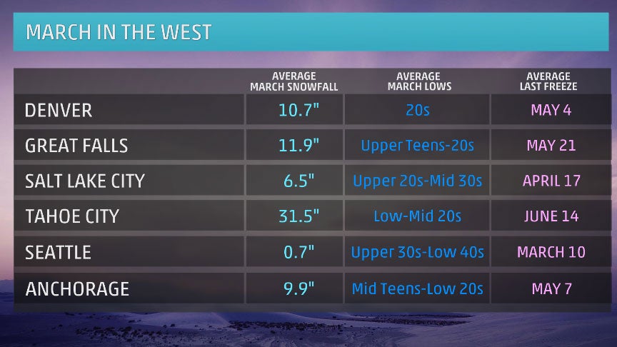 March is the snowiest month of the year, on average, in parts of the High Plains and Rockies, including Denver, Colorado, and Billings, Montana.