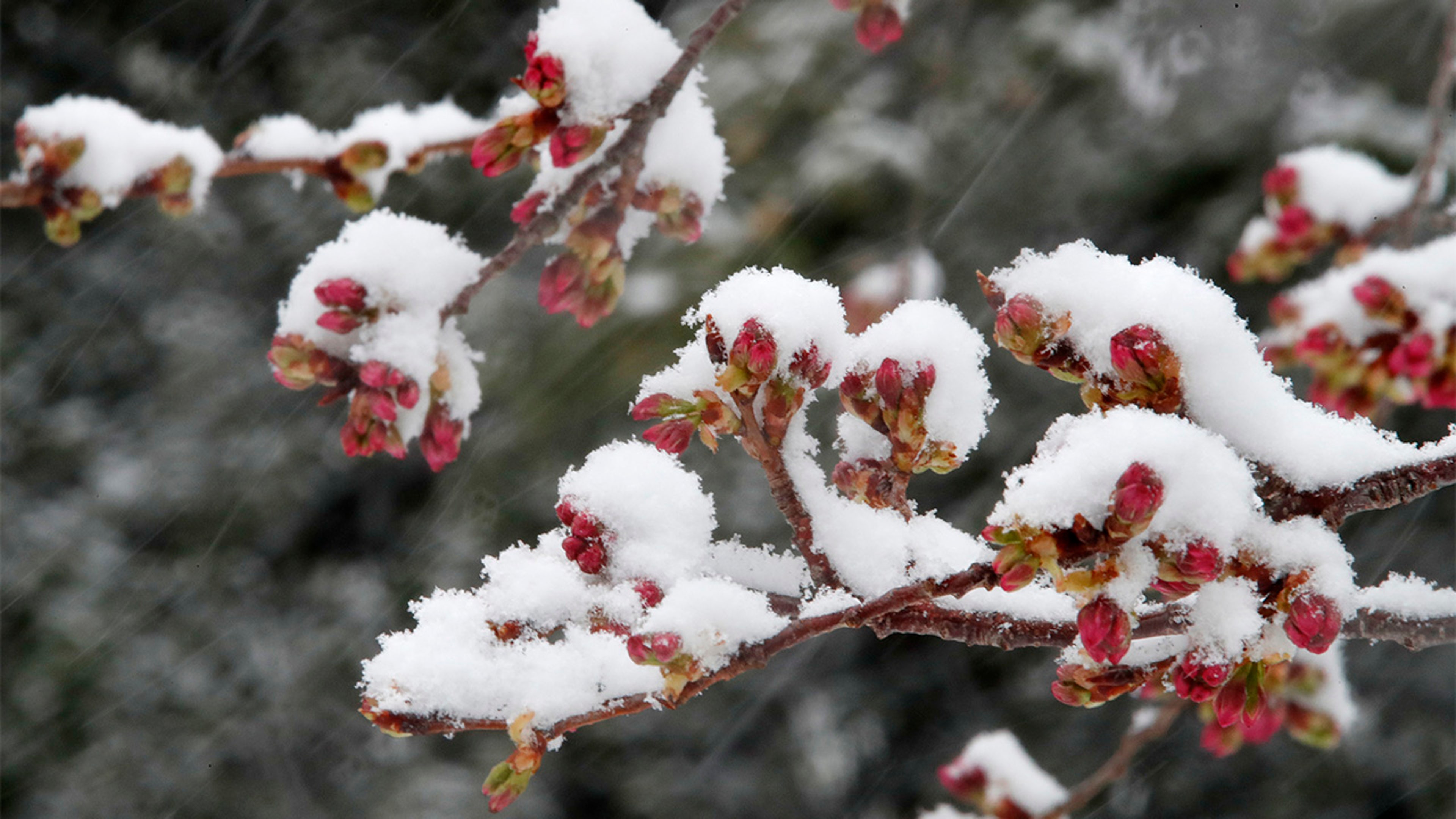 Snow covers budding cherry blossom trees, Wednesday, March 21, 2018, at the tidal basin in Washington D.C. during a snowstorm on the second day of spring.