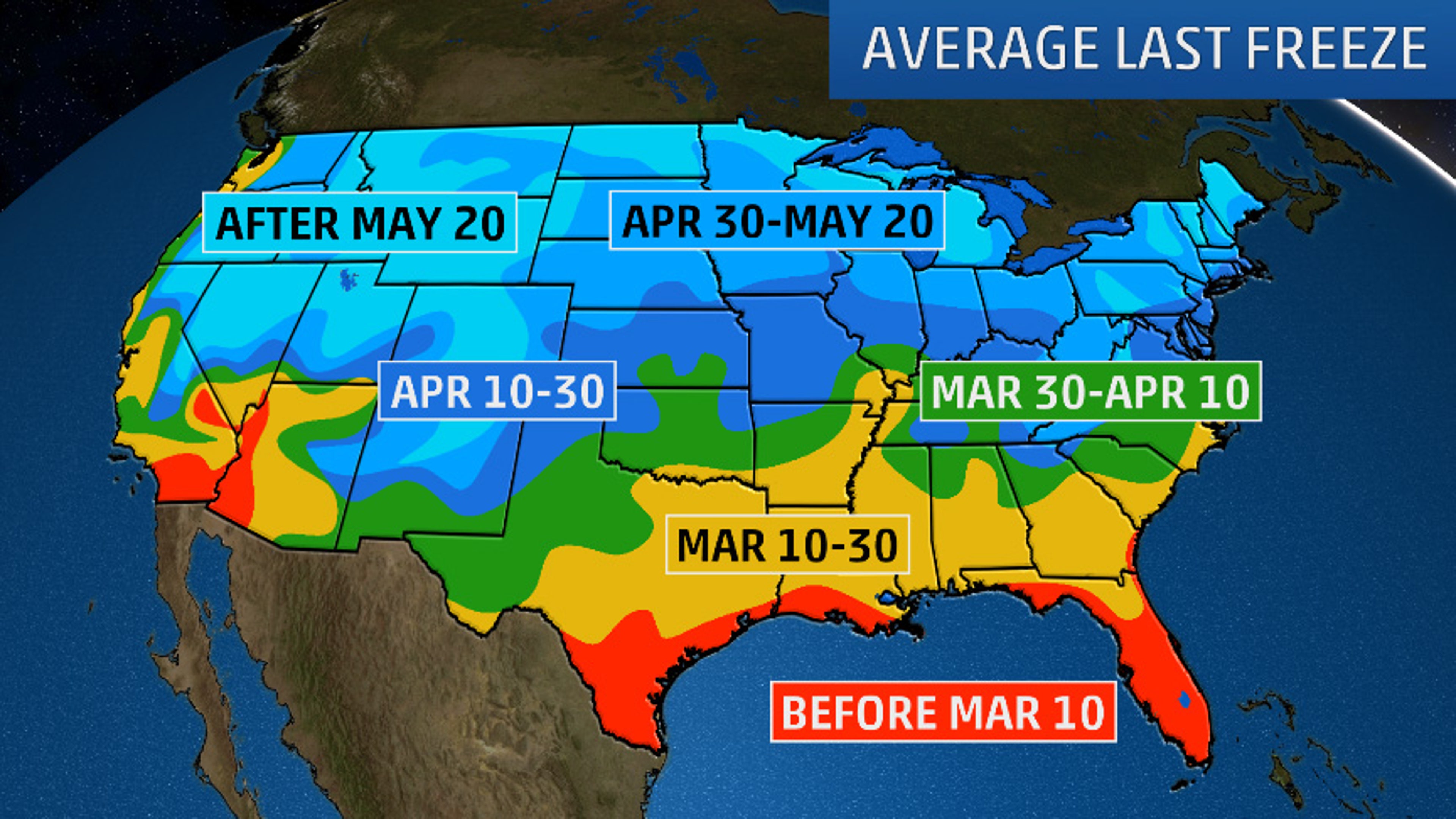 With the exception of typically warm areas, such as the Florida Peninsula, South Texas and the Lower Colorado River Valley, at least one March freeze is typical for much of the Lower 48 states.