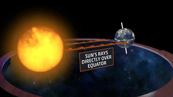 On both the vernal (spring) and autumnal (fall) equinoxes, the sun's most direct rays shine on the equator.