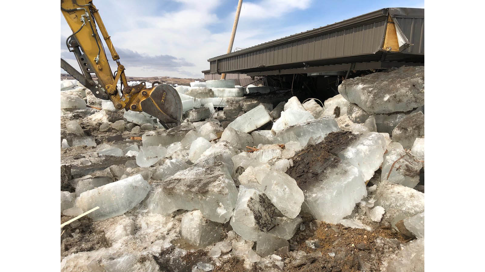 Giant slabs of ice were piled up against the Country Cafe in Niobrara, Nebraska, Saturday, March 16, 2019.