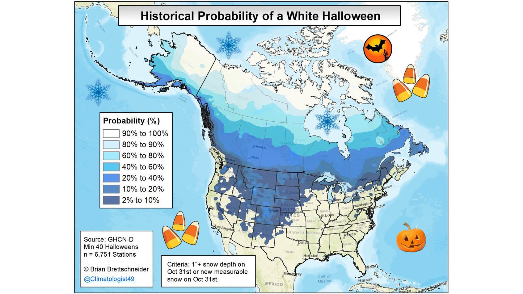 While forecast changes are likely in the days leading up to the holiday, Dr. Brian Brettschneider, climatologist at the University of Alaska-Fairbanks, compiled the map above, which shows the historical probability of a white Halloween across North America.