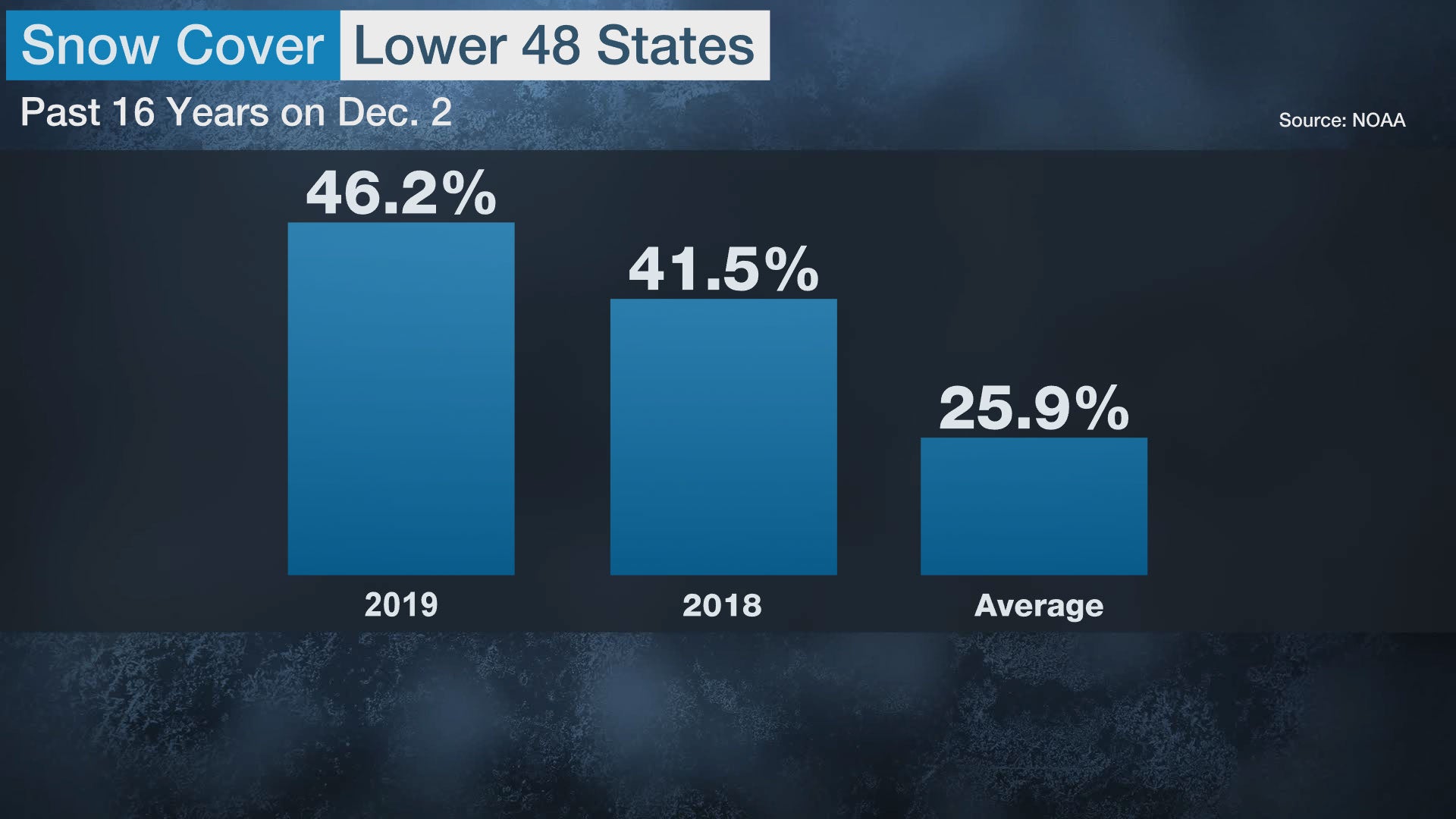 An estimated 46.2% of the contiguous U.S. had snow on ground as of Monday morning, according to NOAA's National Operational Hydrologic Remote Sensing Center. That's well above the 25.9% average Dec. 2 snow cover for the last 16 years.