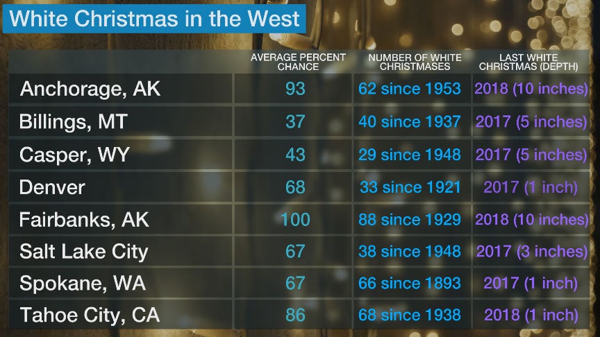 Lower chances for a white Christmas exist in a few areas of the Northeast, Midwest and some of the lower elevations of the West.