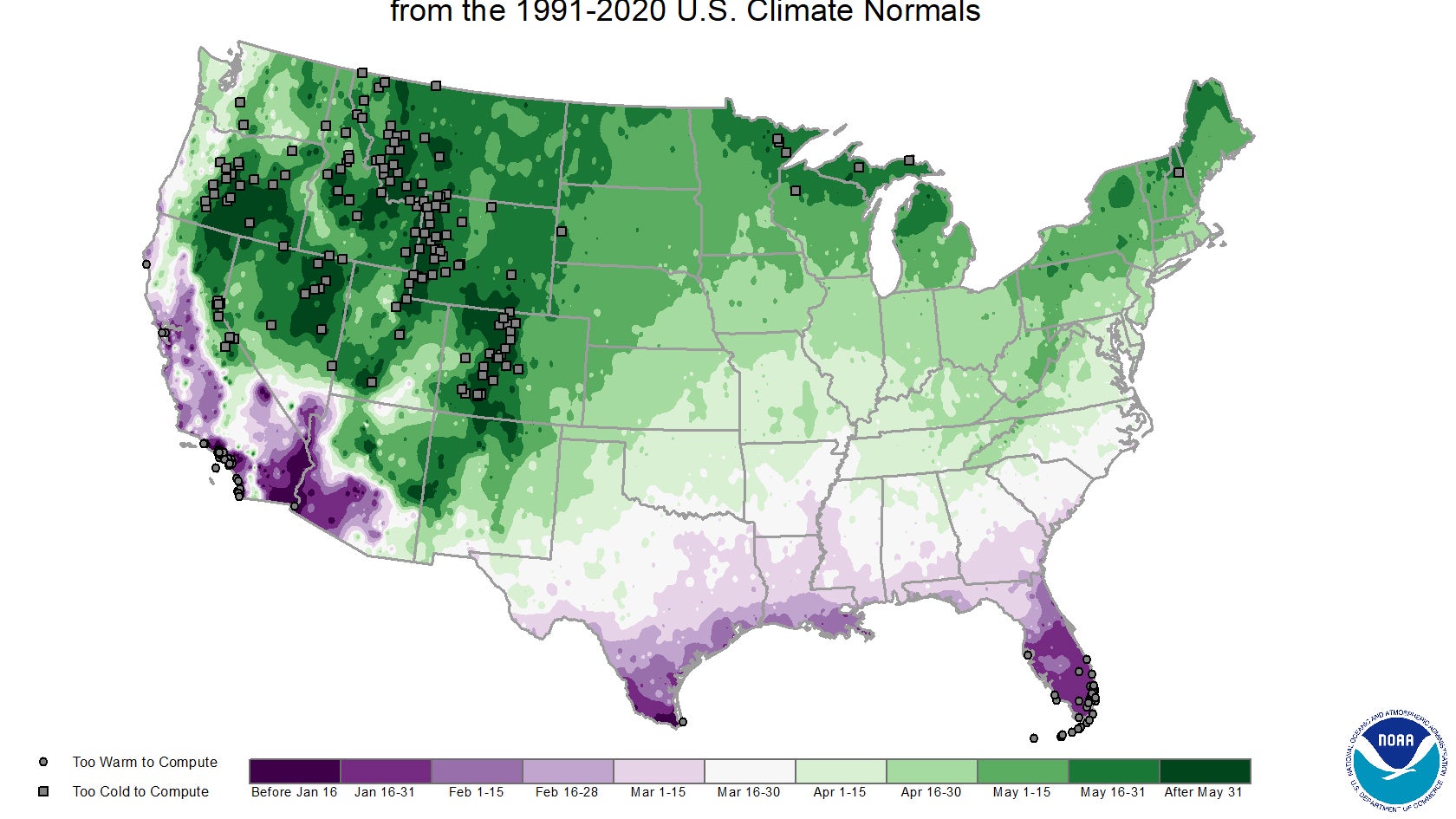 A majority of the U.S. has to wait until at least April for the last spring freeze.