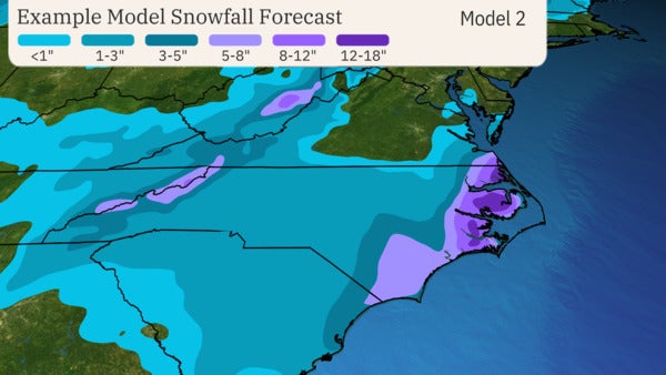 You can see the difference in forecasts in the maps below. These forecasts were made less than a day apart and have huge discrepancies in where the highest snowfall totals will be. One forecast shows up to 18 inches of snow in coastal North Carolina, while the other model shows very little snow there; instead, it's shifted inland.