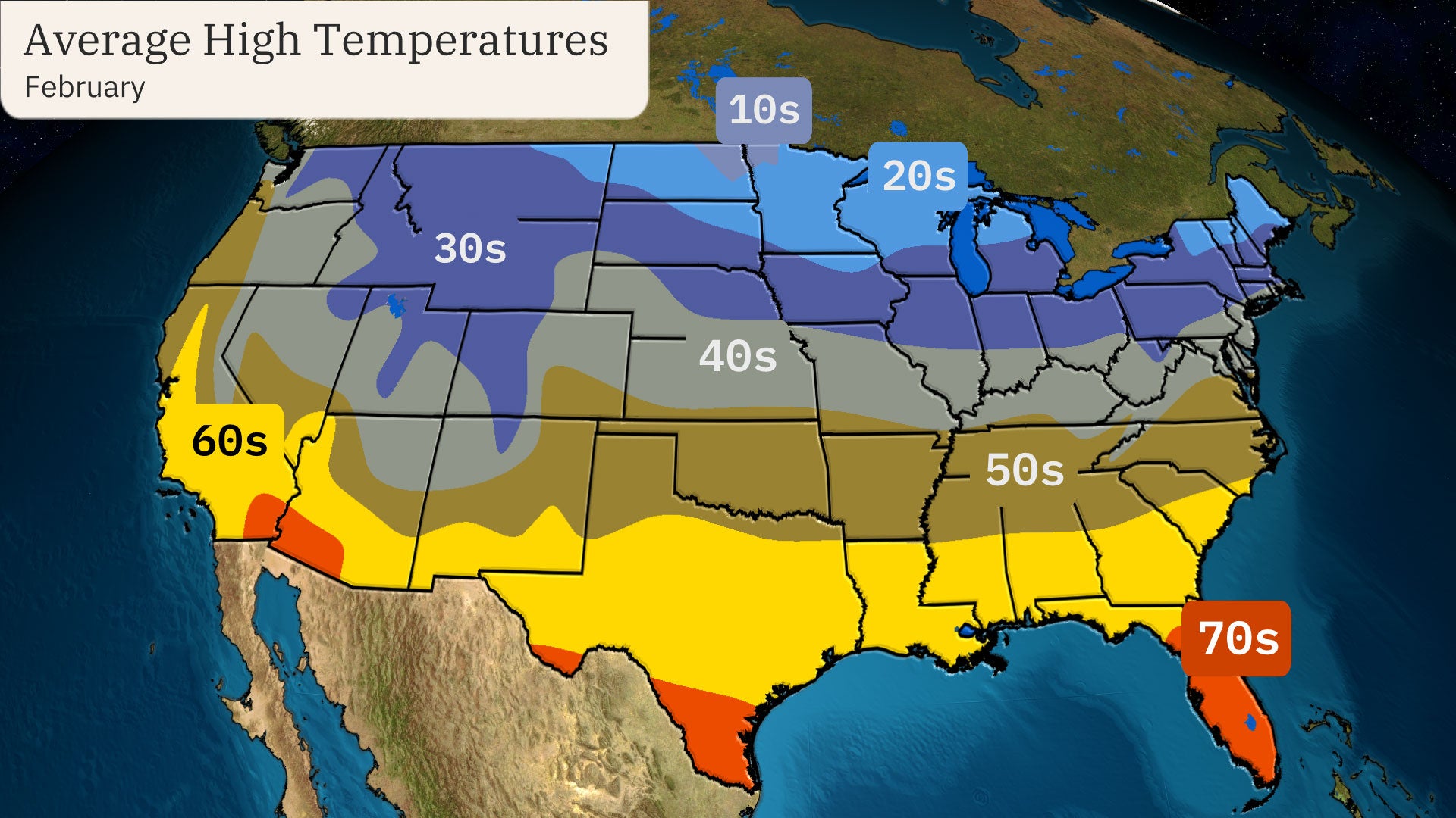 Average highs begin to warm slightly in February, but remain chilly overall. Teens become more confined to northern North Dakota and northwestern Minnesota, while 60s expand into more of the South and into central California. Average highs in the 70s return to parts of the Southwest.