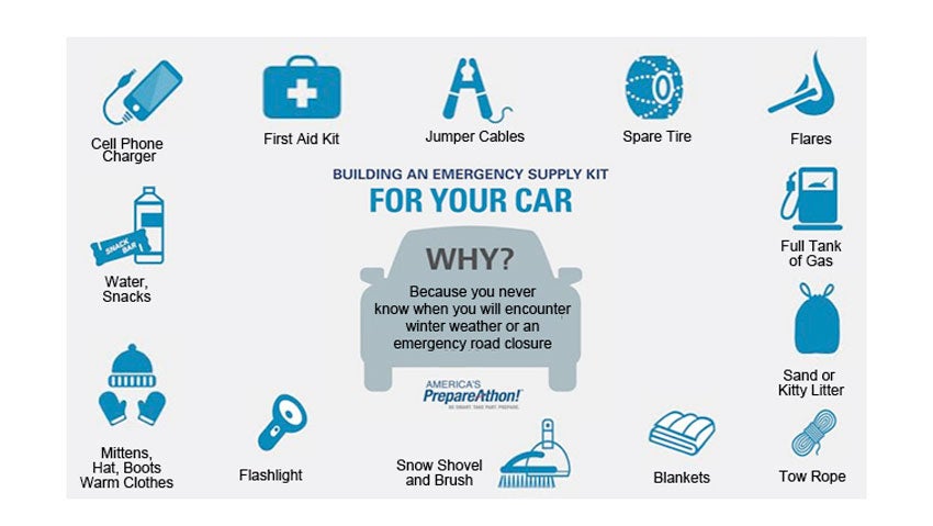 Keep a shovel, sand or cat litter for traction, a windshield scraper and brush, tow rope, a tool kit, booster cables, a compass and roadmaps in your car in case you get stuck or lost.