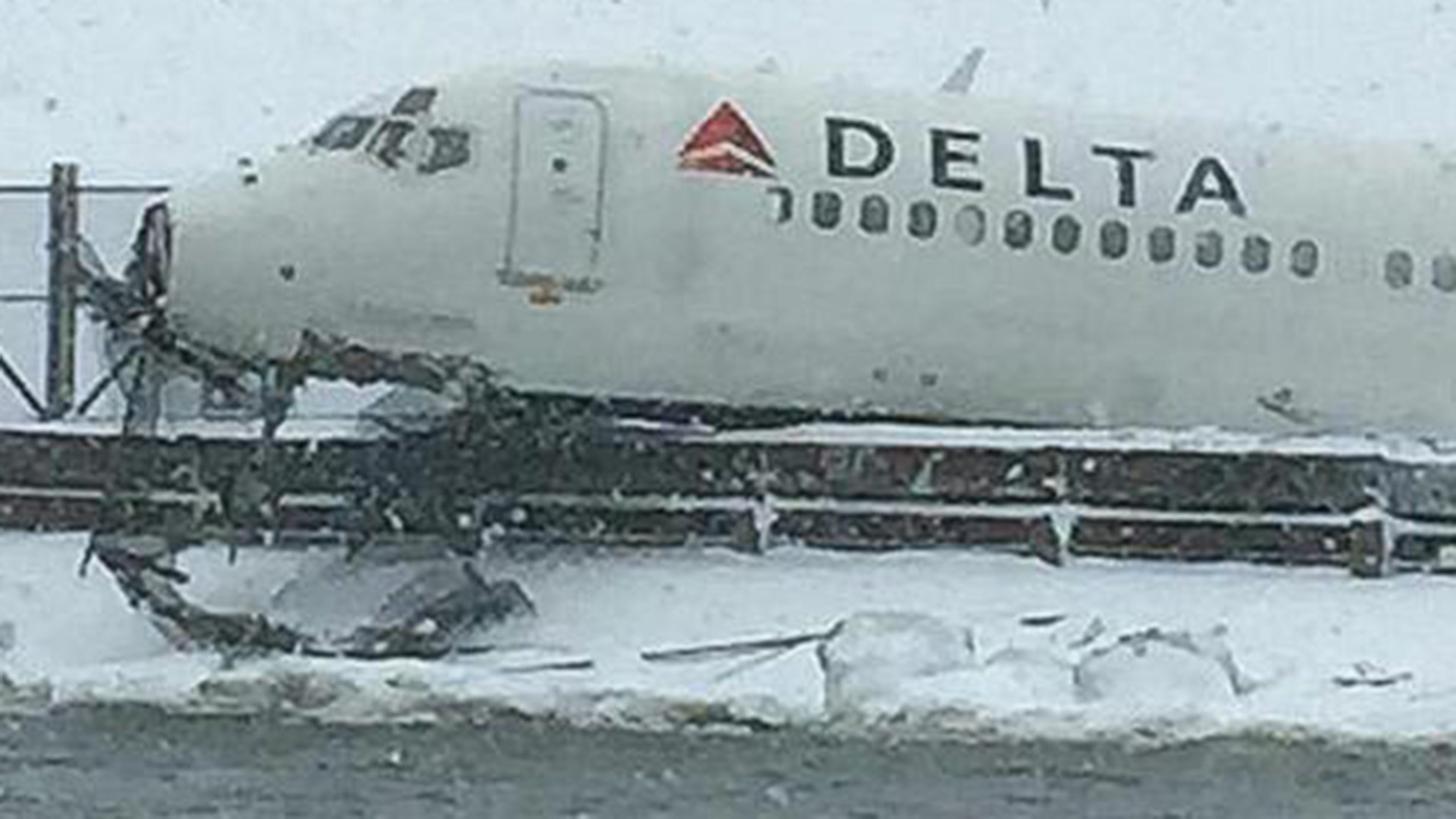 An airplane slid off a runway at New York City's LaGuardia Airport on Thursday, March 5, 2015 during Winter Storm Thor. There were no reports of serious injuries. (Twitter/@NYPDSpecialops)