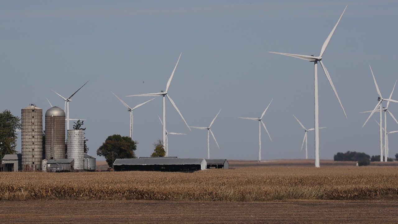 Wind turbines are seen in a corn field behind a farm on October 14, 2019, in Rippey, Iowa