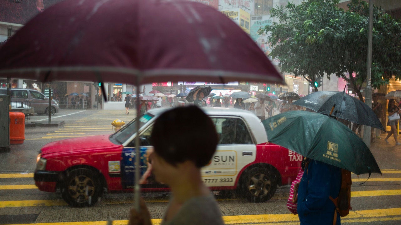 Pedestrians walk with umbrellas during a heavy downpour in Hong Kong's Causeway Bay district on Oct. 19, 2016.