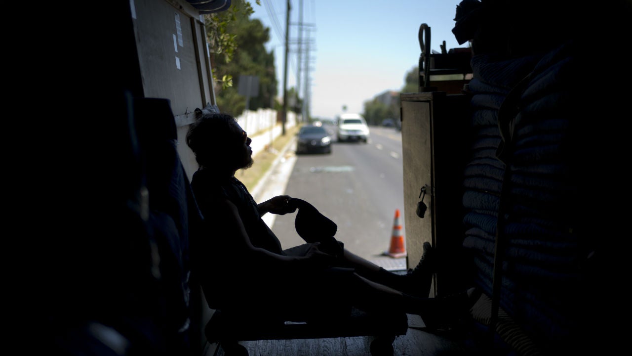 Moving company employee Oscar Vaquez, 29, takes off his hat while resting in a freight container Tuesday, Aug. 29, 2017, in Los Angeles. California energy authorities urged voluntary conservation of electricity Tuesday as a wave of triple-digit heat strained the state's power grid.