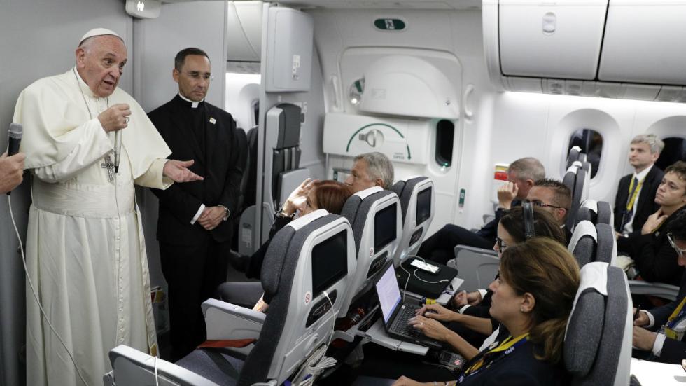 Pope Francis talks to journalists during a press conference he held on board the flight to Rome, at the end of a five-day visit to Colombia, Monday, Sept. 11, 2017.