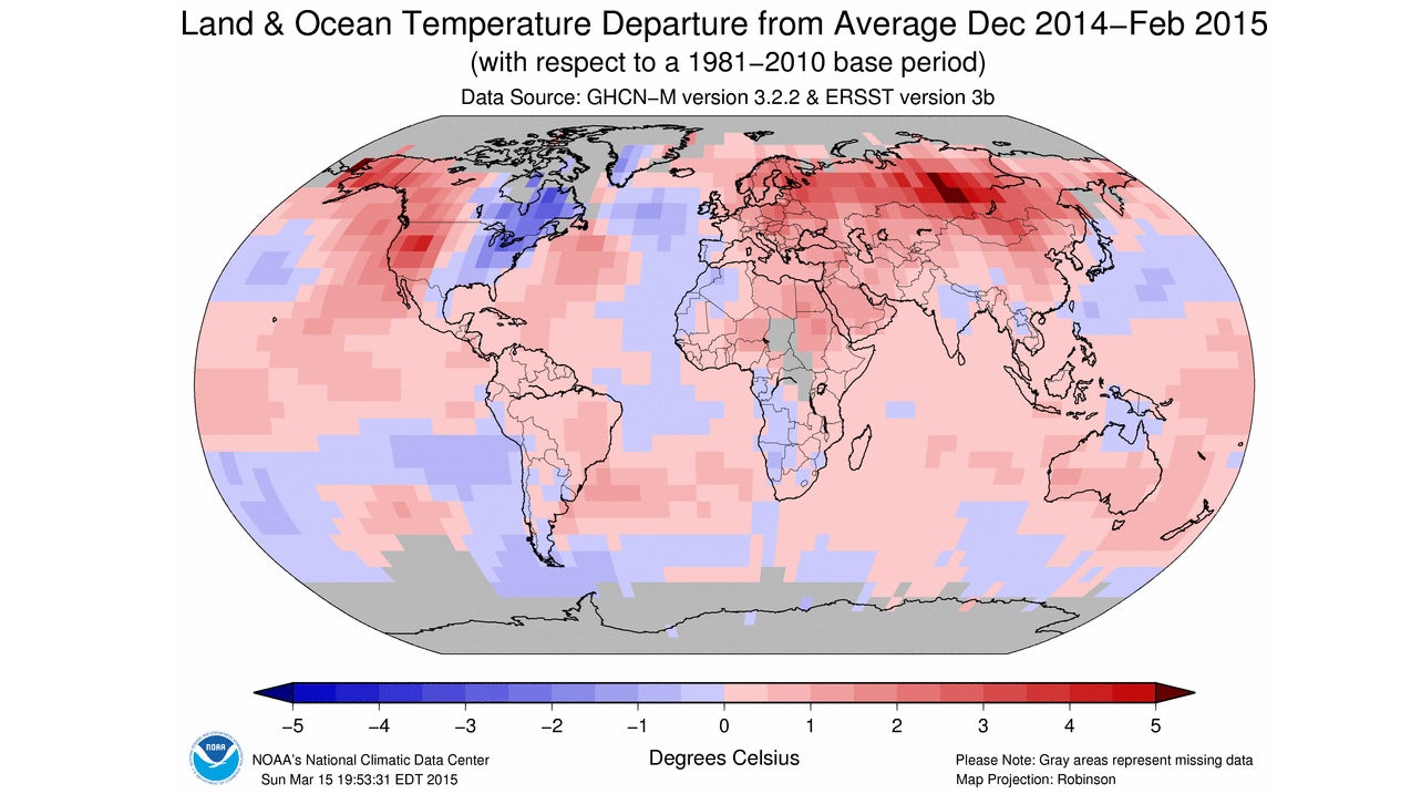 For the United States alone, winter 2014-15 was the 19th warmest on record.
