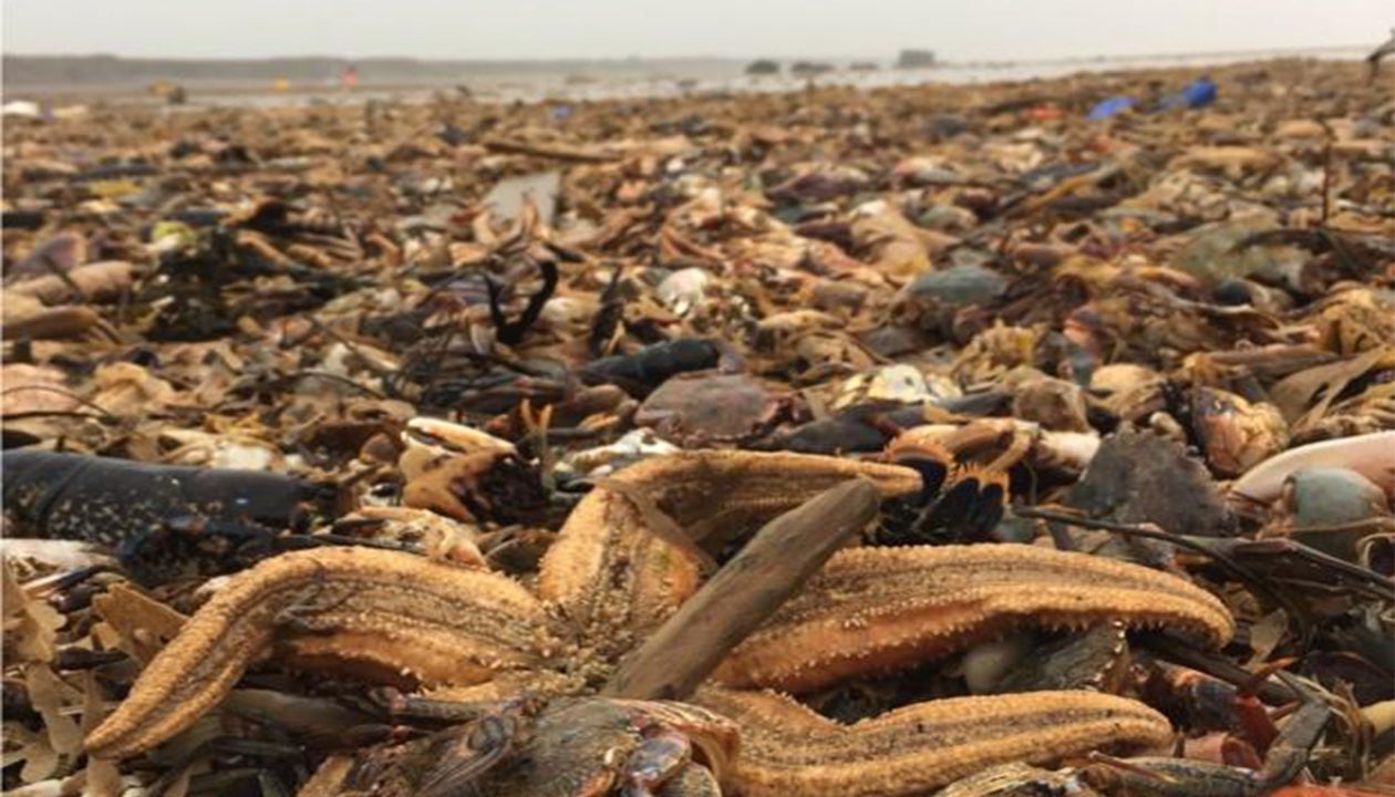 Photos posted to social media show mounds of dead crustaceans including lobster, clams, mussels and starfish washed up on eastern beaches along the North Sea in England.