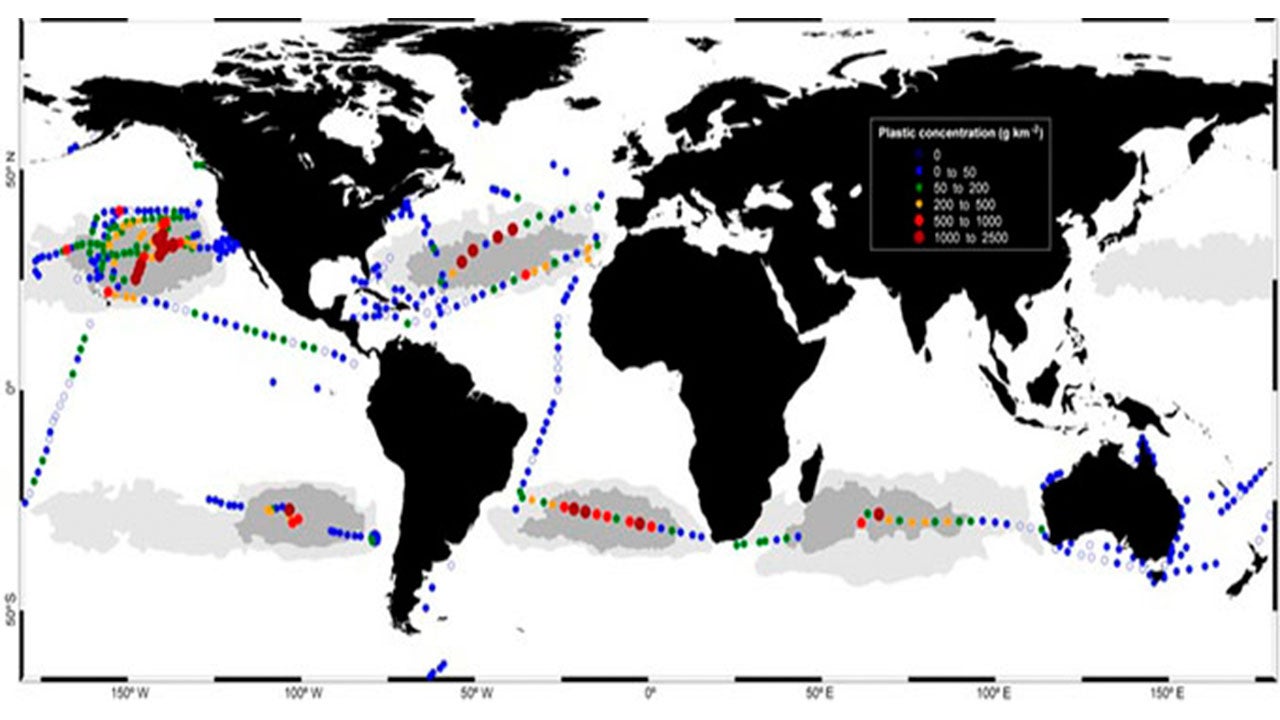 Global plastic concentration map based on data collected during the Malaspina 2010 circumnavigation and regional surveys.