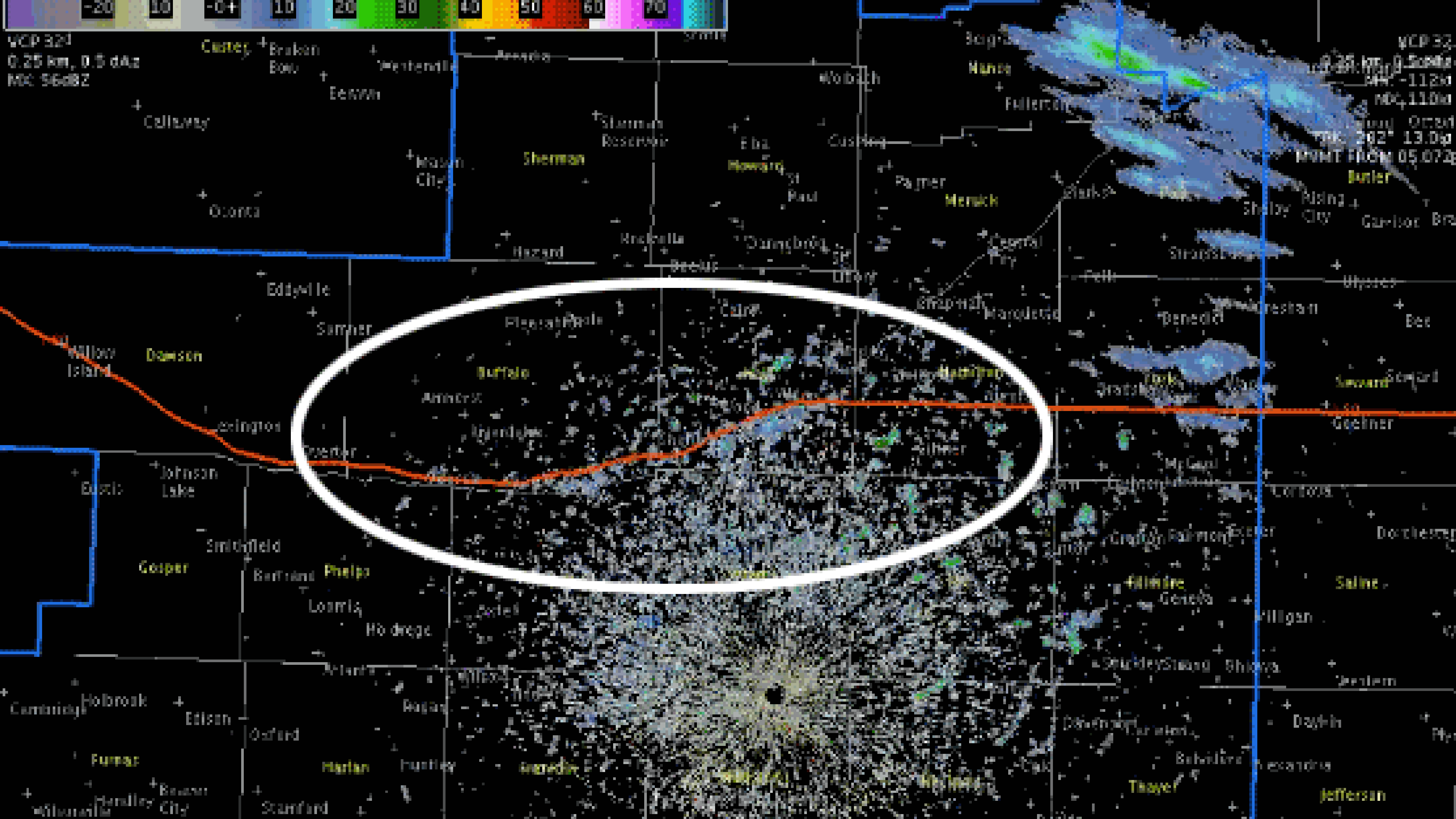 This radar image from March 2, 2016, shows birds that were observed by radar along the Platte River in Nebraska. The birds are represented by the green and blue shadings near the red line, which is Interstate 80 along the Platte River in central Nebraska. Video taken the previous day verified the existence of a large number of sandhill cranes in the area, according to a Facebook post by the Rowe Sanctuary.
