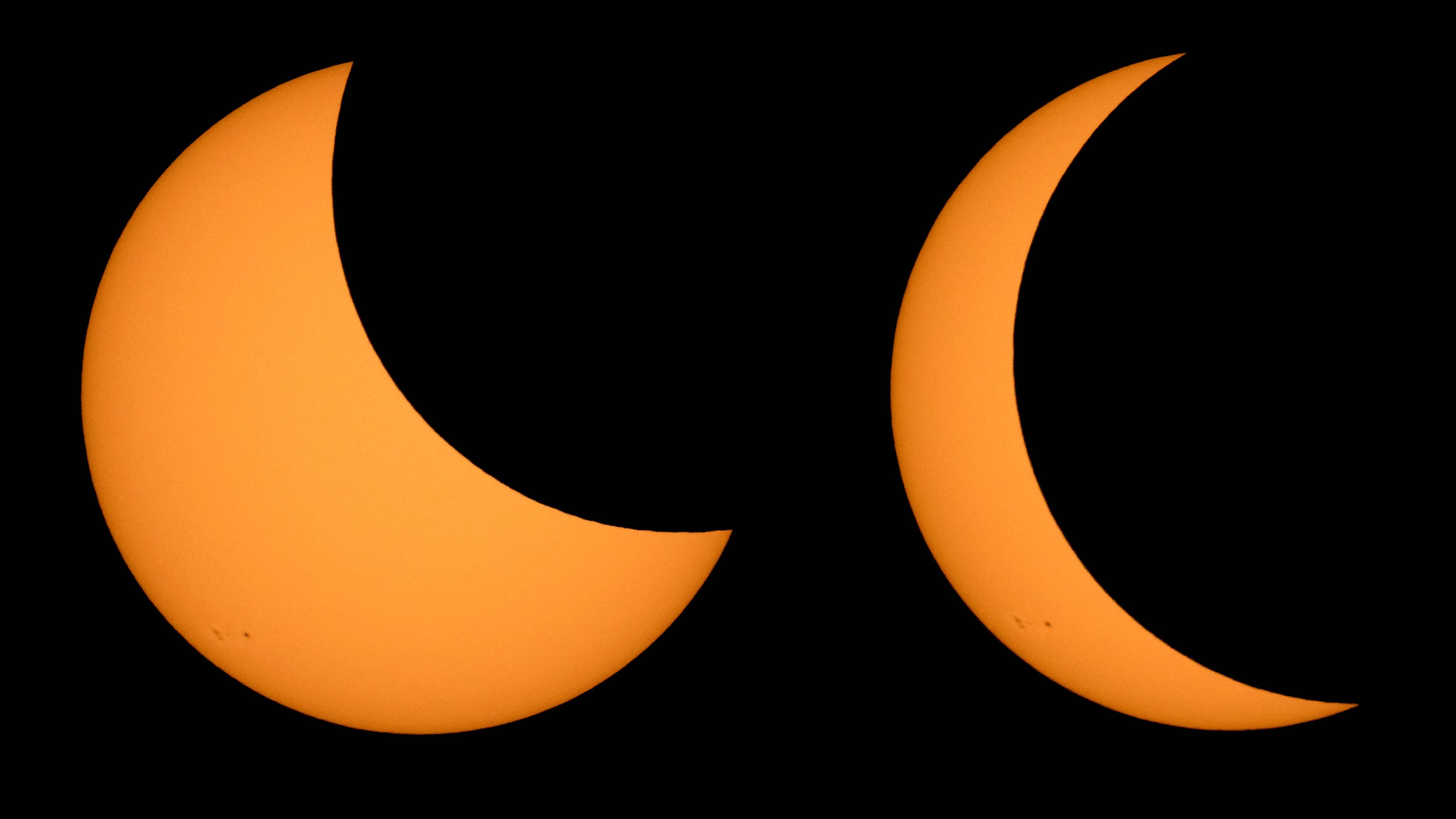 This composite image of two pictures shows the progression of a partial solar eclipse near from Ross Lake, Northern Cascades National Park, Washington on Monday, Aug. 21, 2017.