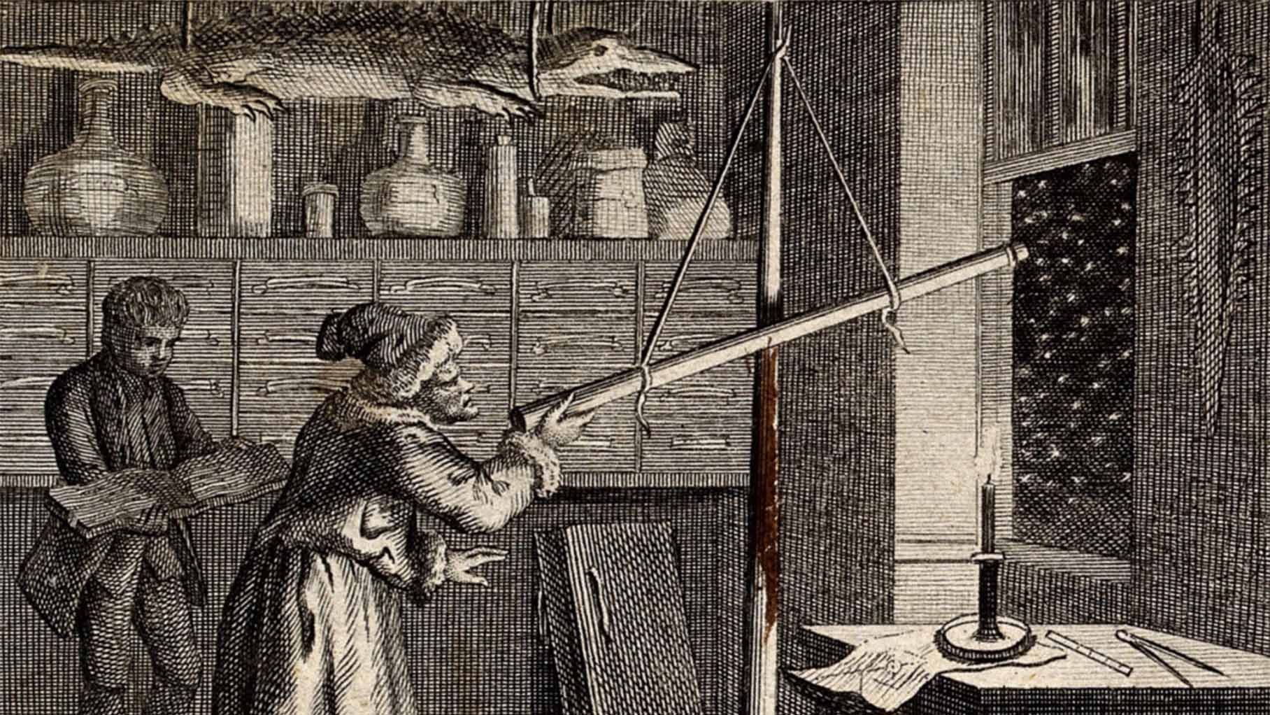 An astronomer in his study, looking out of the window with a telescope. Stargazing has become a lot easier since then! Engraving by C. Grignion after S. Wale, circa 1786.
