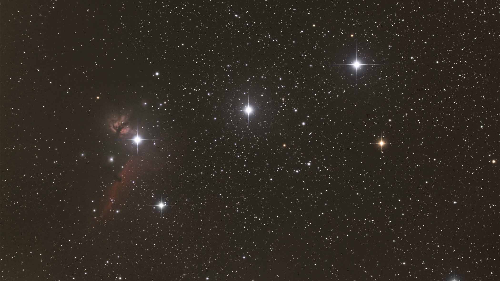 A view of the three stars that make up "Orion's belt" in the constellation Orion at the end of autumn. From the left to the right, we can see the main stars: Alnitak, Alnilam and Mintaka. Under Alnitak, we can see the famous Horsehead nebula.