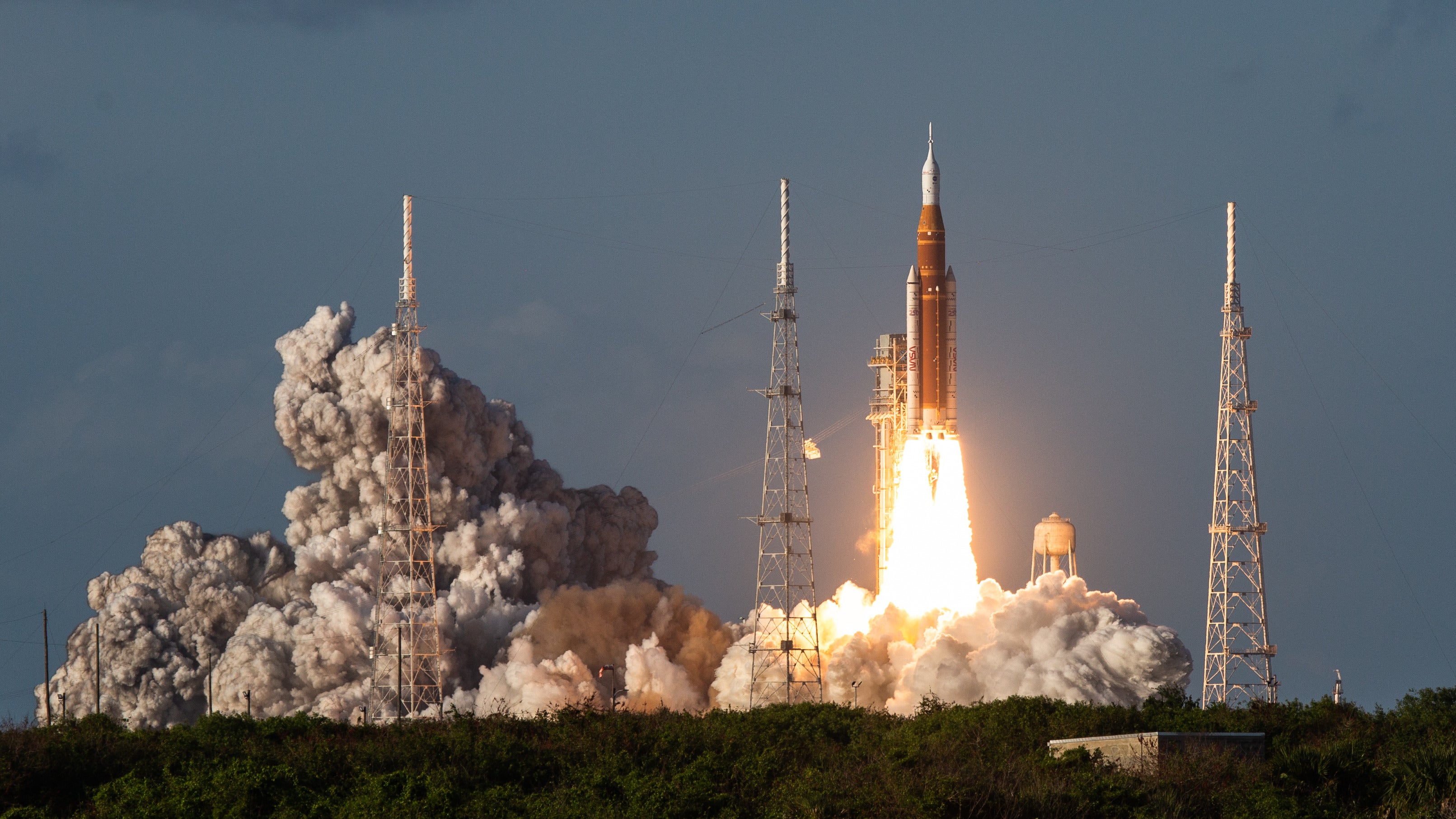 Liftoff of the SLS rocket from pad 39B at the Kennedy Space Center, United States, on [Month Day, Year]. The Artemis II mission marks humanity's return to the Moon after more than 53 years. Commander Reid Wiseman, Pilot Victor Glover, mission specialist Christina Koch, and Canadian Space Agency astronaut Jeremy Hansen embark on a 10-day mission around the Moon and back, allowing NASA to fully test the Orion Crew Capsule for future Artemis Program missions.