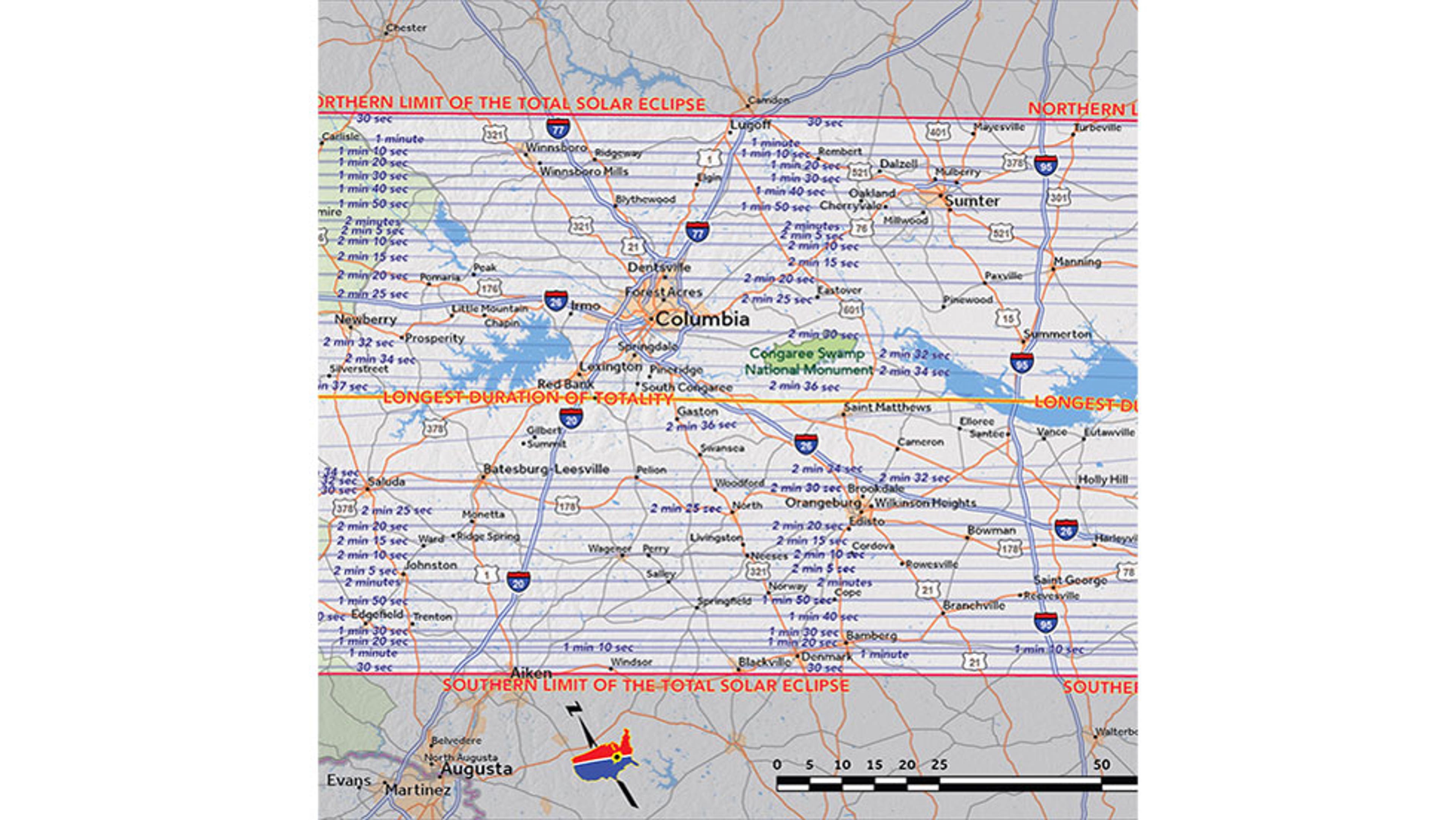 Columbia is another sizable city with a long duration of totality plus a fine network of highways for mobility on eclipse day. For millions of Americans along the Atlantic Seaboard, this will be the most accessible city with accommodations in the path of the total solar eclipse.