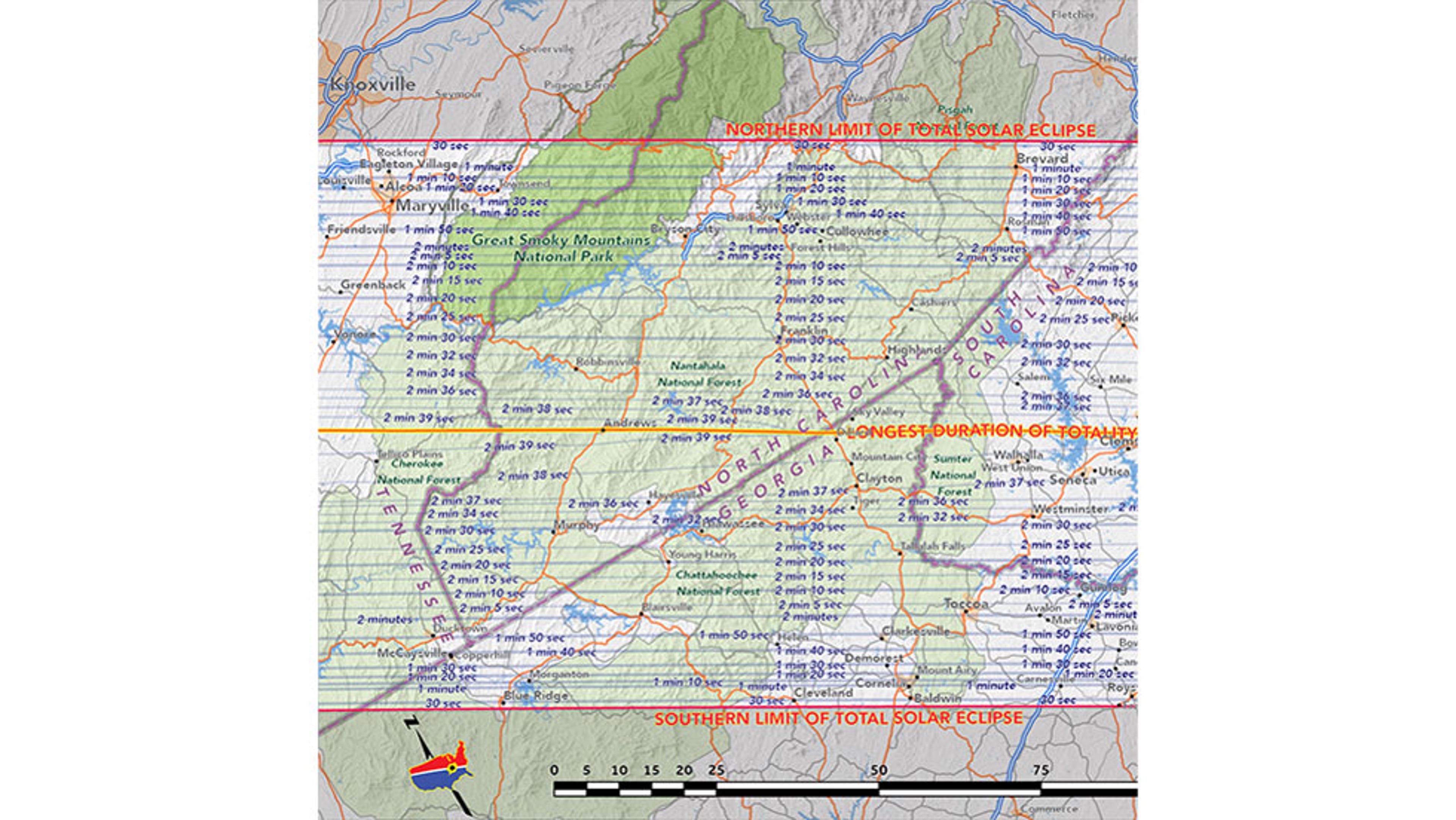 Weather permitting, the Great Smoky Mountains will offer great vistas for the eclipse. Clingman’s Dome will be an intriguing location to view the eclipse due to its expansive views. This site provides the possibility of seeing the Moon’s shadow racing across the landscape, a dramatic sight that will add another dimension to your experience of the eclipse.