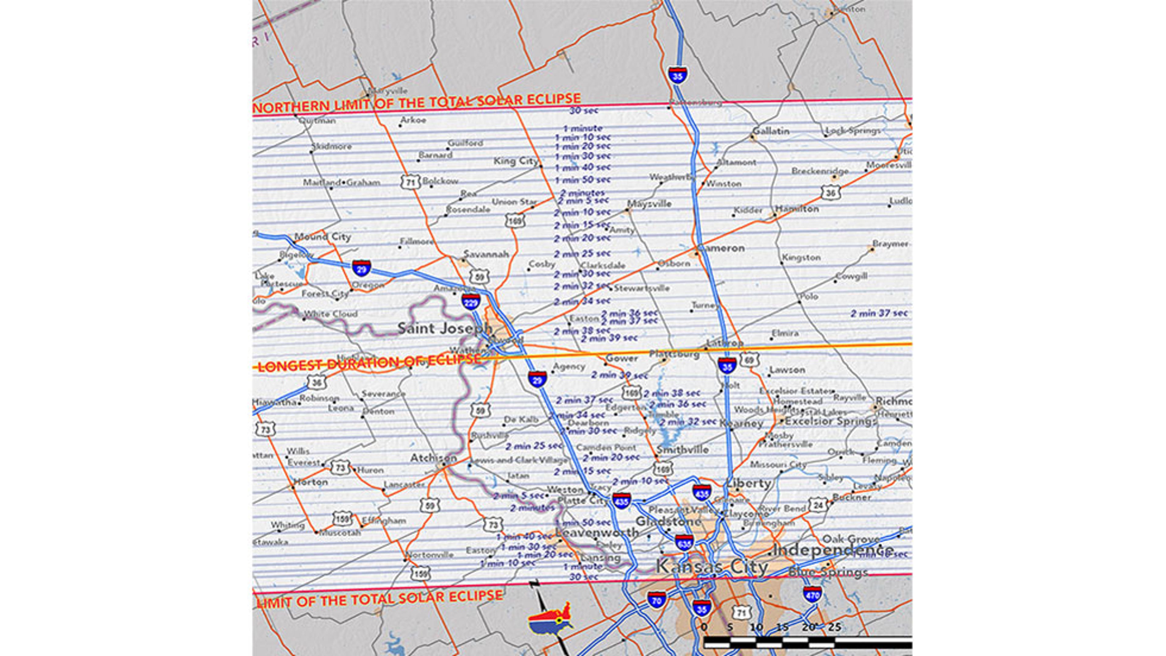 St. Joseph is right on the centerline of the eclipse path and enjoys one of the longest durations of any sizable city in the nation. A large eclipse viewing party is being organized at the Rosecrans Memorial Airport with educational speakers, solar telescopes, and more. If you would like to enjoy the eclipse in the company of astronomers, this is an ideal choice.