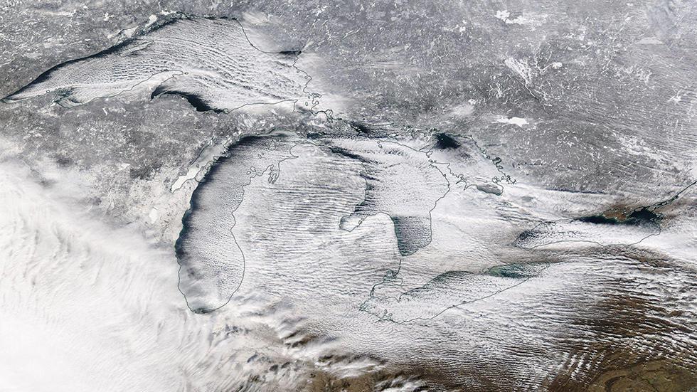 Lake-effect snow bands blanket the Great Lakes region on January 5, 2015, in this high-resolution image from NASA's Aqua satellite.