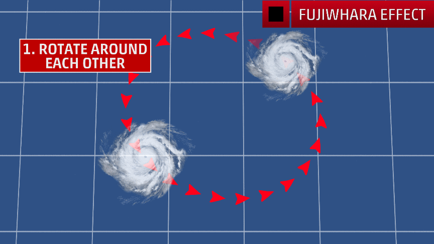 The Fujiwhara effect, named for Dr. Sakuhei Fujiwhara, the meteorologist who first described the phenomenon in 1921, is the rotation of two weather systems around each other in close distance.