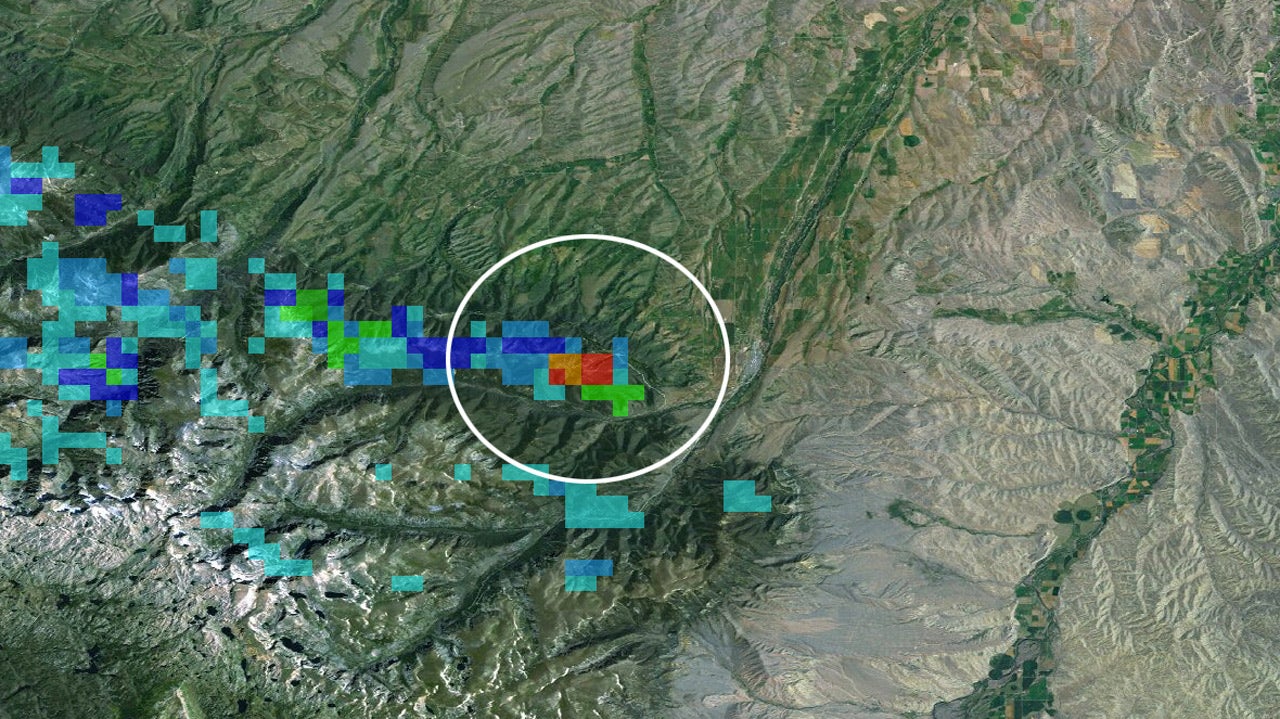 The red and orange pixels depict where the chair lift was detected by radar at Red Lodge Mountain ski area in Montana on Monday morning. (NOAA)