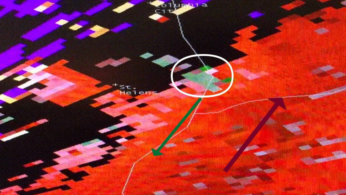 Detailed radar image from the Portland radar including the Densa Jaguar encircled in white. Objects moving away from the radar are shown in red pixels while objects moving toward the radar are shown in green. In this case, the green arrow also denotes the movement of the Densa Jaguar, toward the south and southwest along the Columbia River.