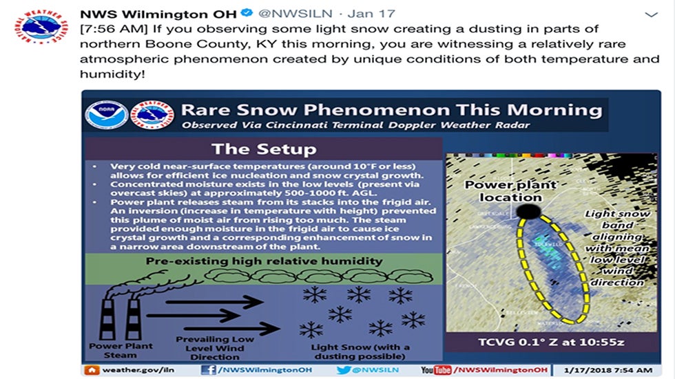 This isn't a phenomenon completely new to meteorologists. Power plant snow was also seen in the Tulsa, Oklahoma, on the same morning. Both locations reported light accumulations on the downwind side of their respective power plants. Some in northern Kentucky had up to 4 inches of power plant steam snow.