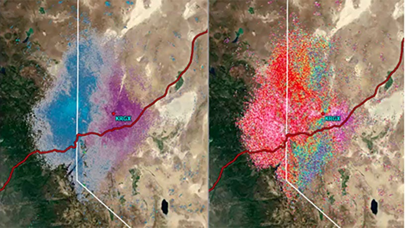 The NWS office in Reno, Nevada, posted to Twitter on March 27, 2015, the radar image above that shows the spring migration of Monarch butterflies. These butterflies were spotted using a differential reflectivity scan, which is typically used to identify different types of precipitation, hail size and tornadic debris. As shown in the example above, it can also identify non-meteorological echoes such as birds and insects. In this case, the NWS says the differential reflectivity shows objects that are much wider than they are taller, or what you would expect from the body type of a butterfly.