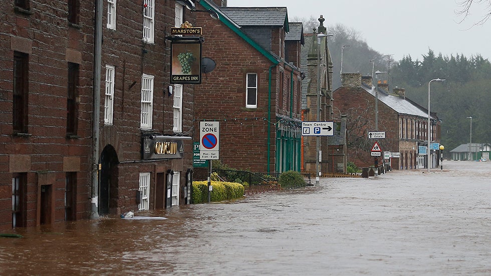Flooded roads in the centre of Appleby, northwest England, as Storm Desmond hits the United Kingdom, Saturday Dec. 5, 2015. Roads have been closed throughout the North and Scotland as Storm Desmond caused road chaos, landslides and flooding.