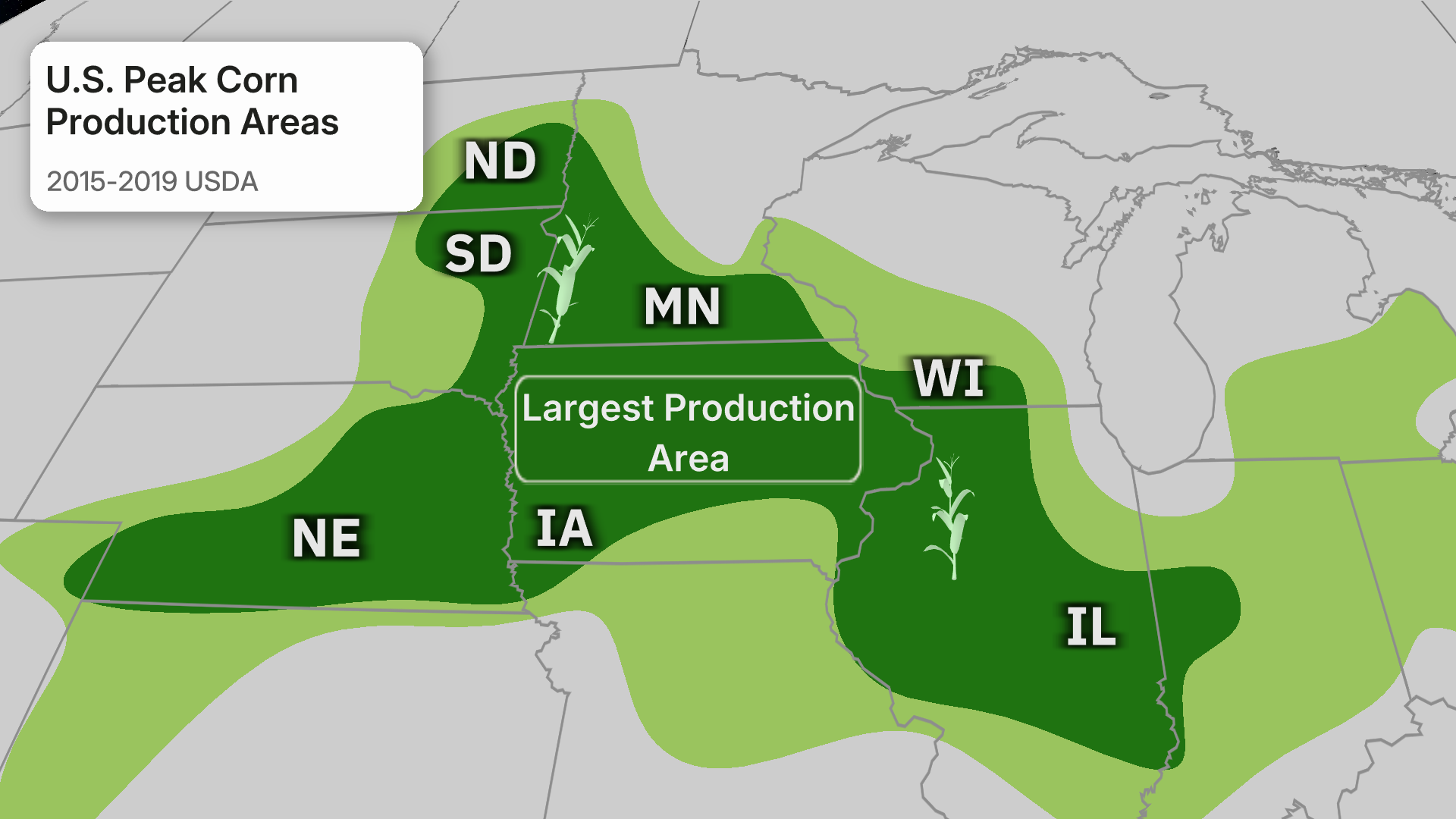 Corn sweat gives a localized boost to dew points in the region when the crop is in full swing during midsummer. That's especially the case in areas where the crop's production is largest, in the darker green shading below.