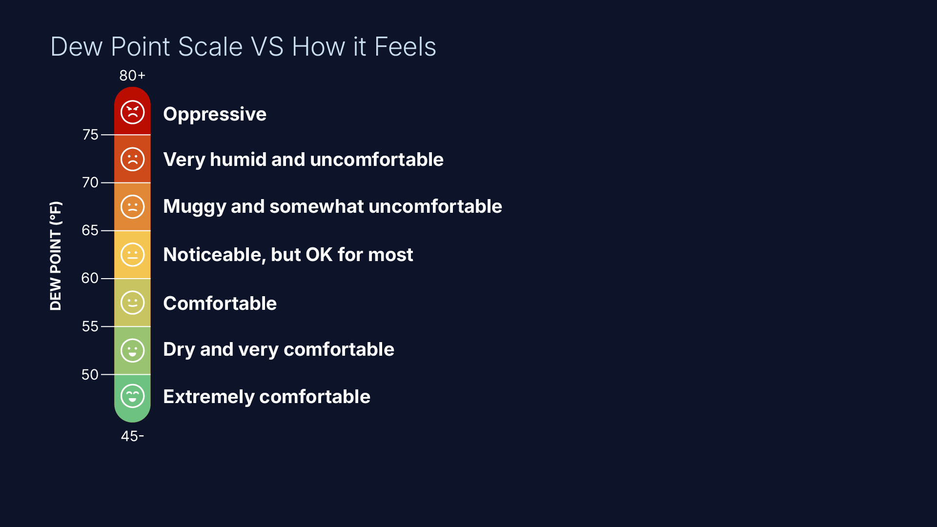 As the chart below shows, a dew point that's generally 75 degrees or higher is considered oppressive.