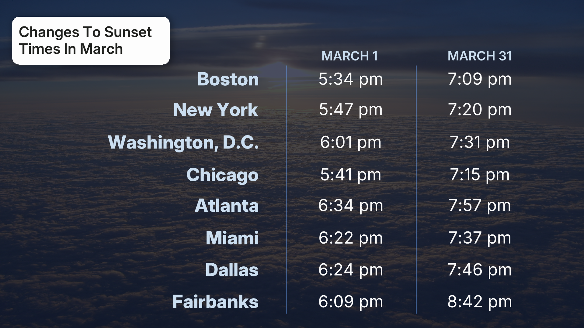 What time the sun sets on March 1 and March 31 in several U.S. cities.