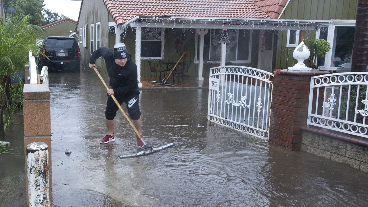 A resident in Santa Ana, California, squeegees water out of the driveway of his home, Wednesday, Jan. 6, 2016.