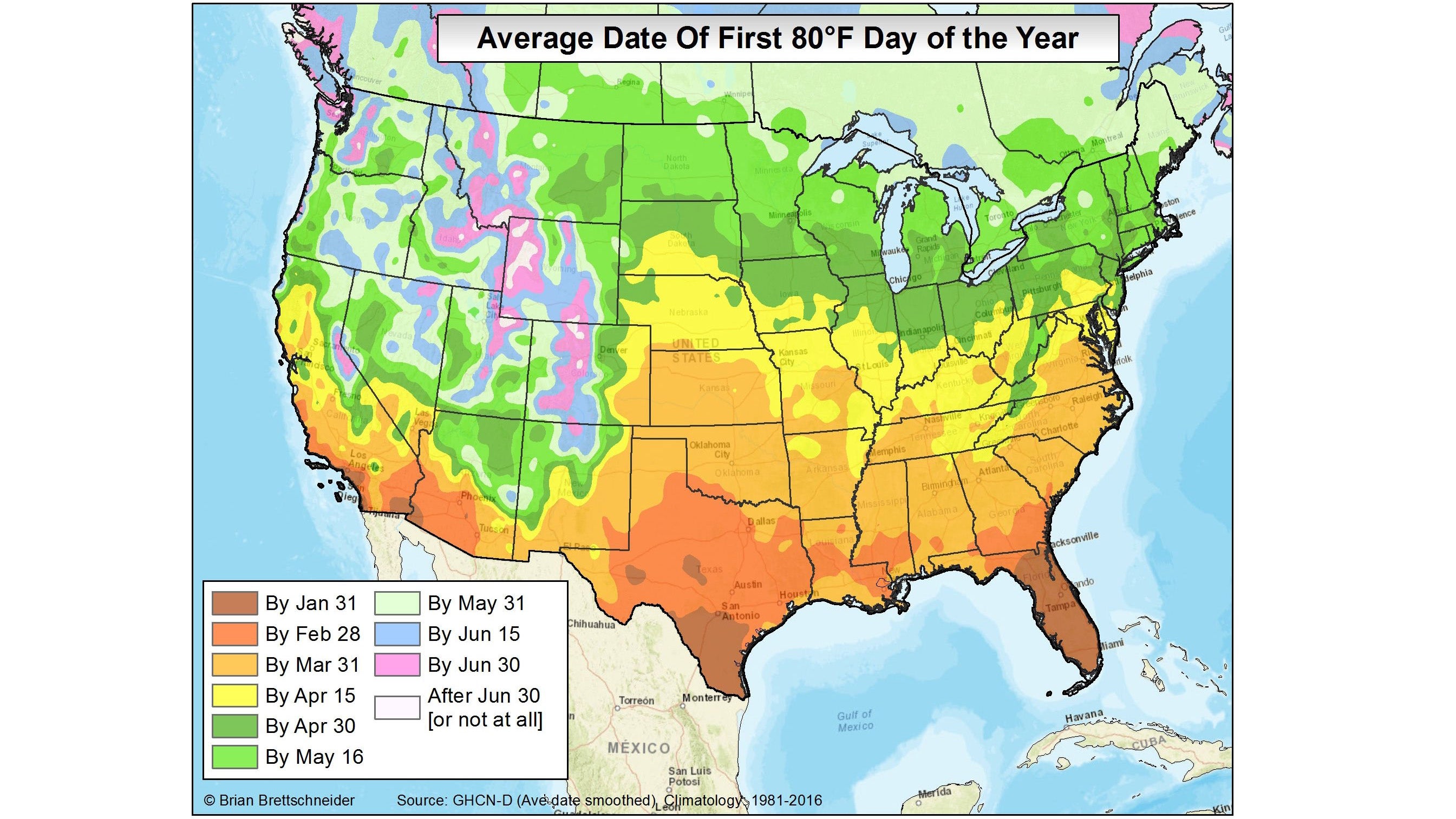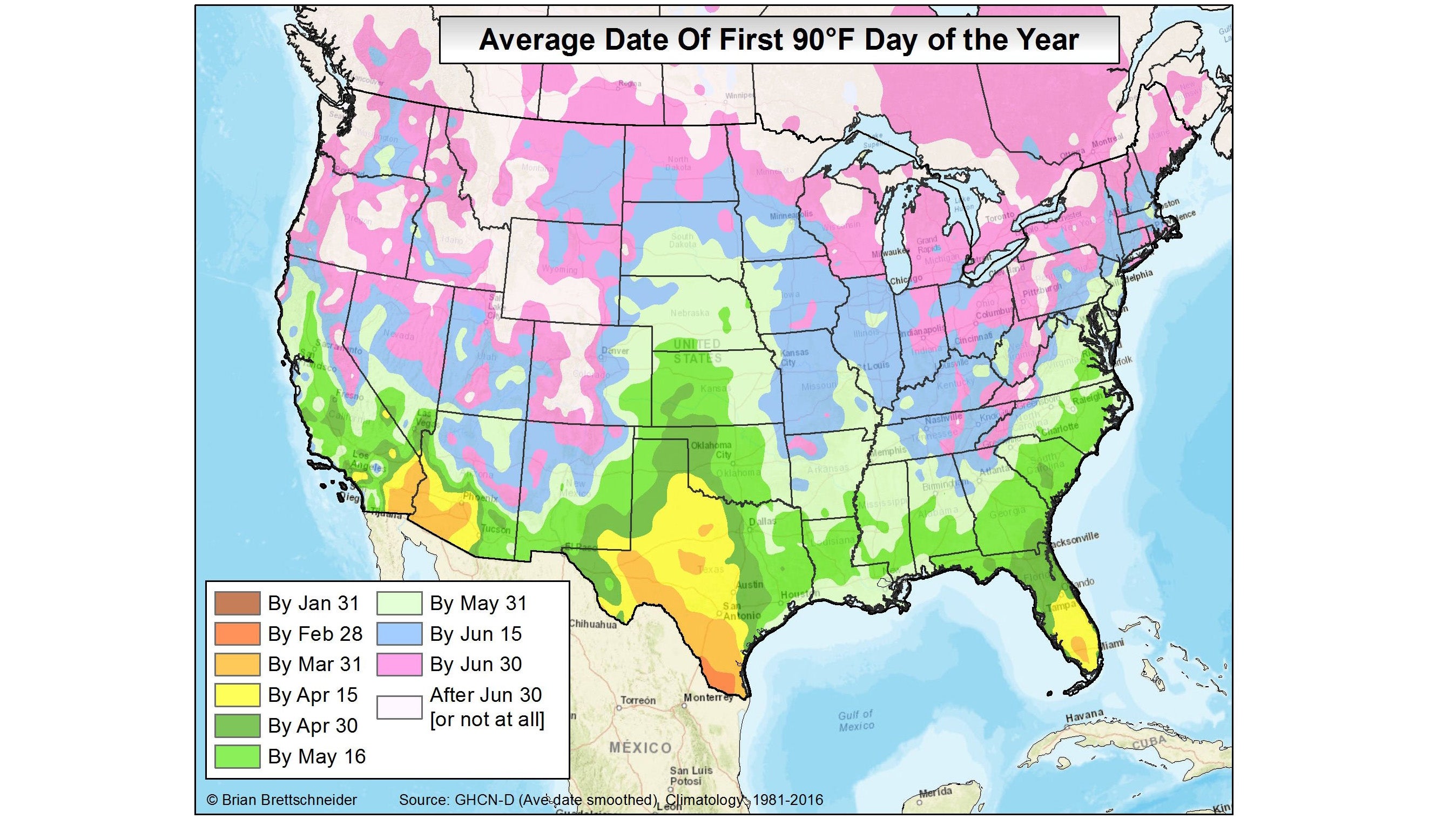 Climatologist Dr. Brian Brettschneider of the University of Alaska-Fairbanks and the Western Regional Climate Center sifted through the data and created the maps shown below, which provide a visual guide to indicate the dates 80 and 90 degrees are achieved for the first time in an average year.