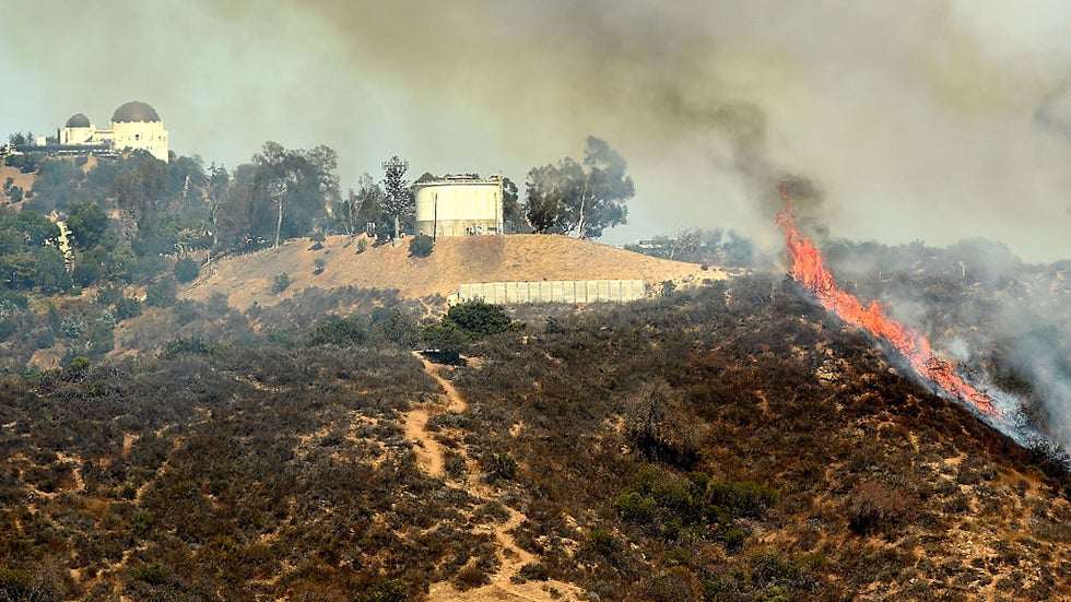 A wildfire burns in the Hollywood Hills on July 19, 2016 in Los Angeles, California.