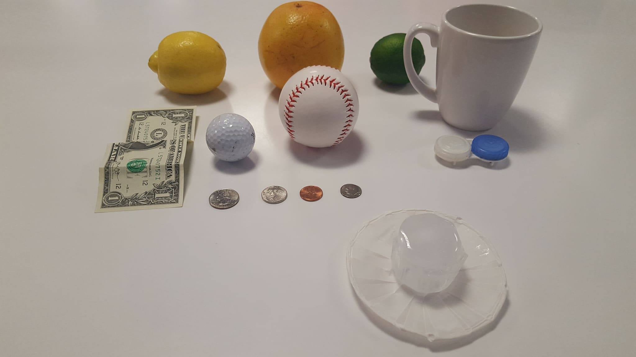The most helpful objects are coins, but regulation size sports objects such as golf balls and baseballs are also helpful for larger hail stones.