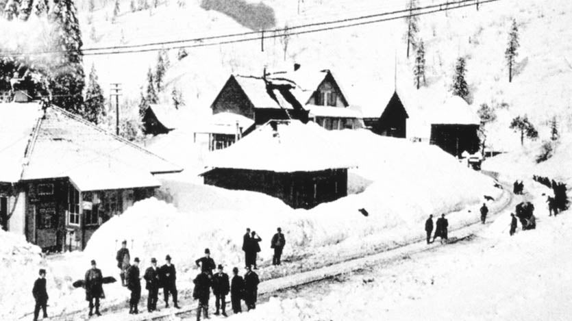 Ever since the Donner Party of migrants tried to cross the Sierra Nevada in 1849, the eponymous mountain pass has been plagued (and blessed) by prodigious winter snowfalls. The rail line over the summit was completed in 1866 and several stations along the route, that were established for track maintenance, measured amazing snowfalls. Such was the case in Blue Canyon, pictured above and buried during the winter of 1916-17.