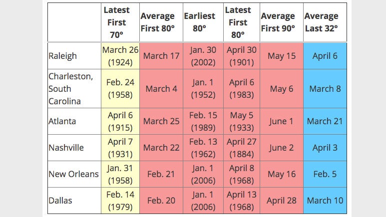 The South enjoys milder conditions much sooner than the Northeast. Temperatures in the 70s typically occur in January for most of the region, although the latest 70-degree temperatures on record in Atlanta and Nashville are in early April. For many, however, it won't feel like spring until the temperatures climb well into the 70s.