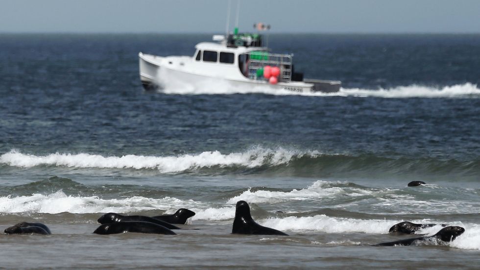 A fishing boat passes as a colony of several hundred seals sit on a sandbar at High Head Beach during low tide on Cape Cod on August 12, 2012 in Truro, Massachusetts.