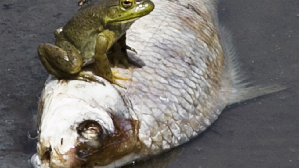 A frog sits on a dead fish in a pond near Waterloo, Neb. on Tuesday, July 31, 2012. It is unclear what caused the fish to die but possible culprits are the low water levels due to the drought, high water temperatures due to the hot weather and a lack of oxygen in the water.