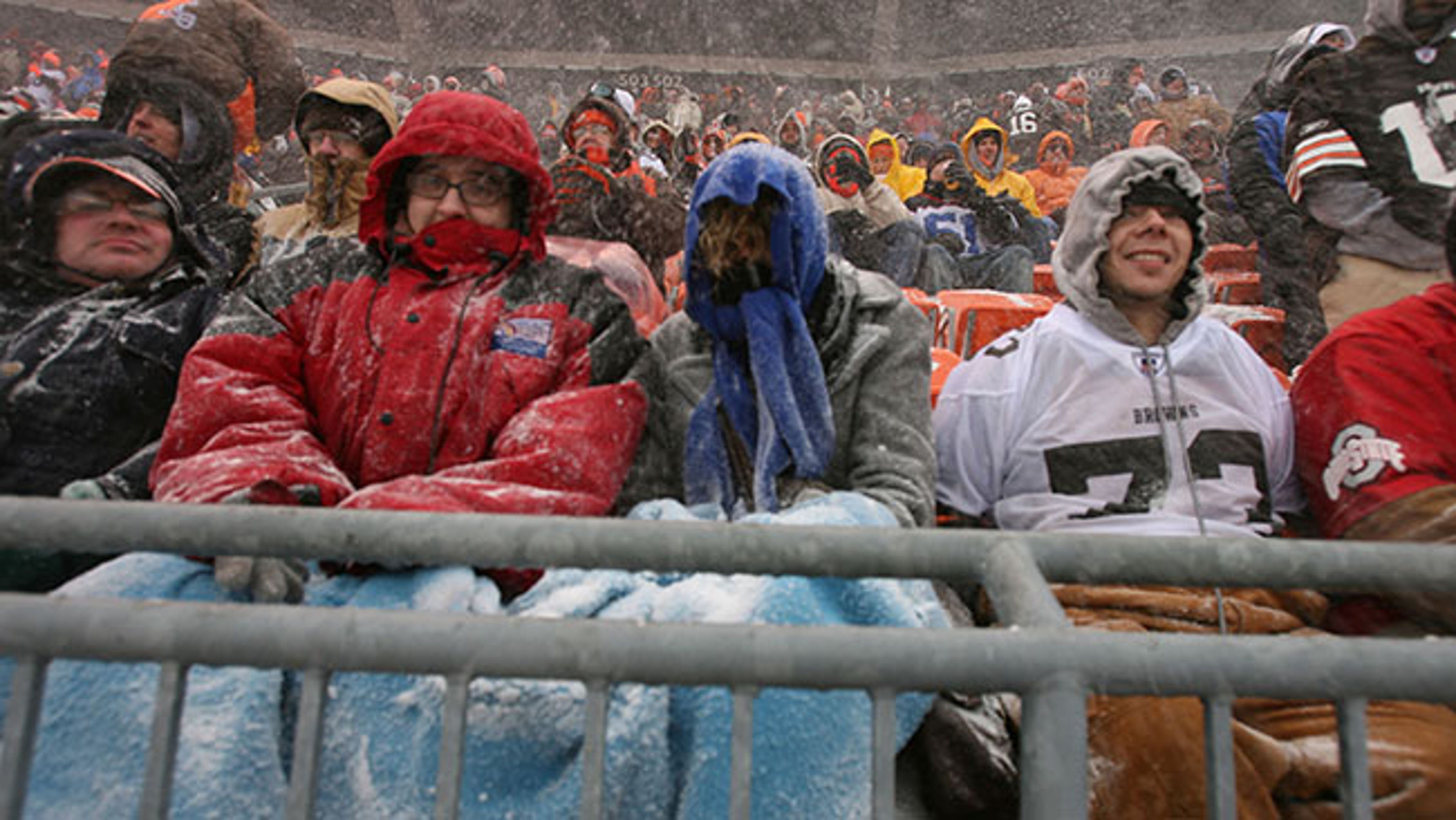Fans brave the weather to watch the Buffalo Bills play the Cleveland Browns at Cleveland Browns Stadium in Cleveland, Ohio, on Dec. 17, 2007.