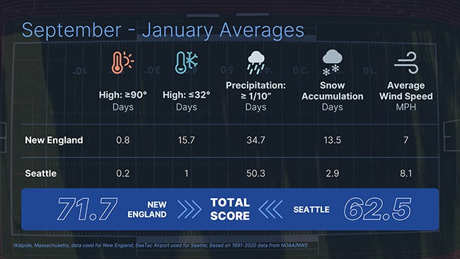 Southeast Massachusetts averages over 10 more days of accumulating snow during an NFL season than Seattle.